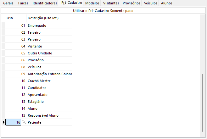 Nesta guia, informe os identificadores que poderão utilizar o pré-cadastro de crachás.