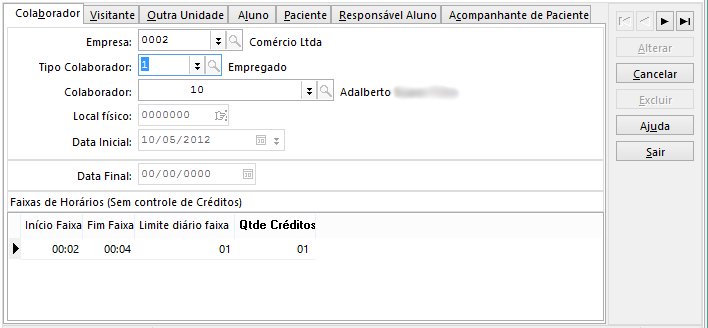 - O sistema não permite sobreposição de faixas para um mesmo local físico. Porém é possível ter uma faixa de créditos de acesso para um colaborador com o mesmo horário para local físico e global;