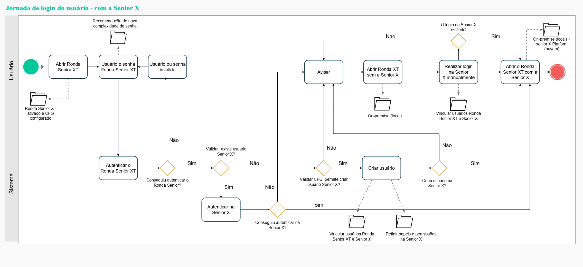 Se a senha do usuário do Ronda Senior não estiver nesse padrão, no primeiro acesso, o usuário da Senior X será criado com uma senha aleatória e criptografada a partir dos dados do usuário. Dessa forma, o administrador da Senior X poderá editar posteriormente.