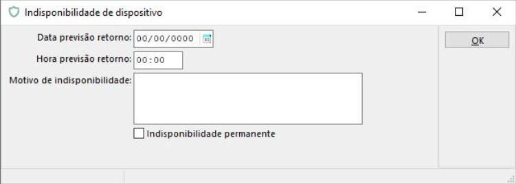 Caso o usuário possua o módulo de Auditoria de Registros na Proprietária e o dispositivo esteja em um local alfandegado, ao alterar o status de comunicação para desativado/ off-line ou desmarcar o campo Dispositivo ativo, uma tela será exibida para informar o motivo da desativação e a data prevista de retorno do dispositivo.