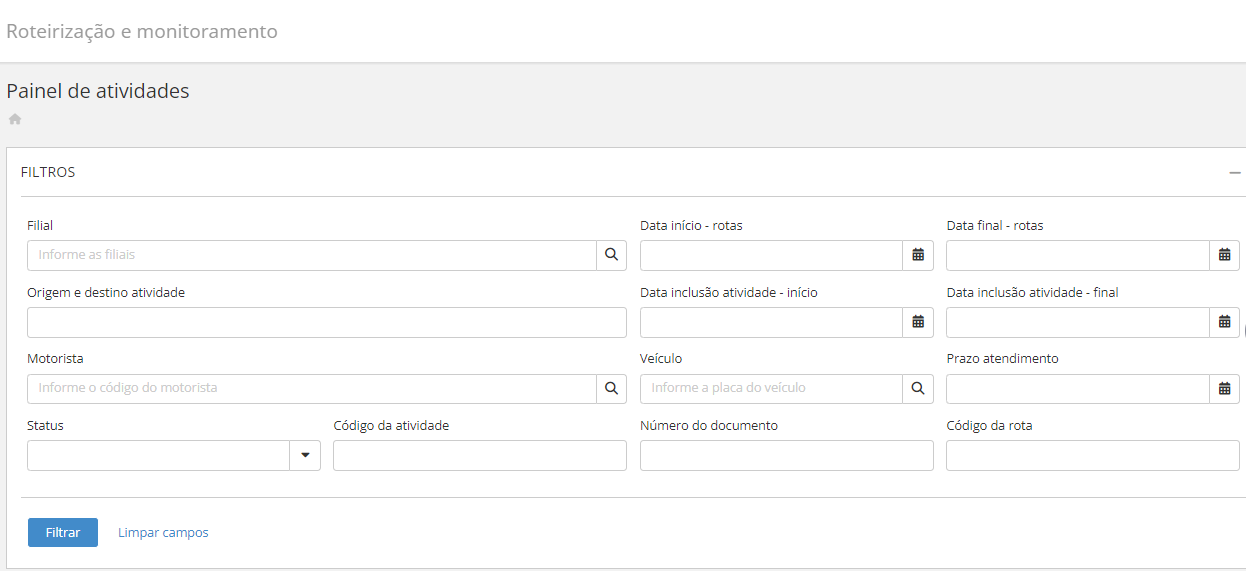 Acesse através no menu Logística > Otimização Logística > Roteirização e Monitoramento > Analytics > Painel Atividade