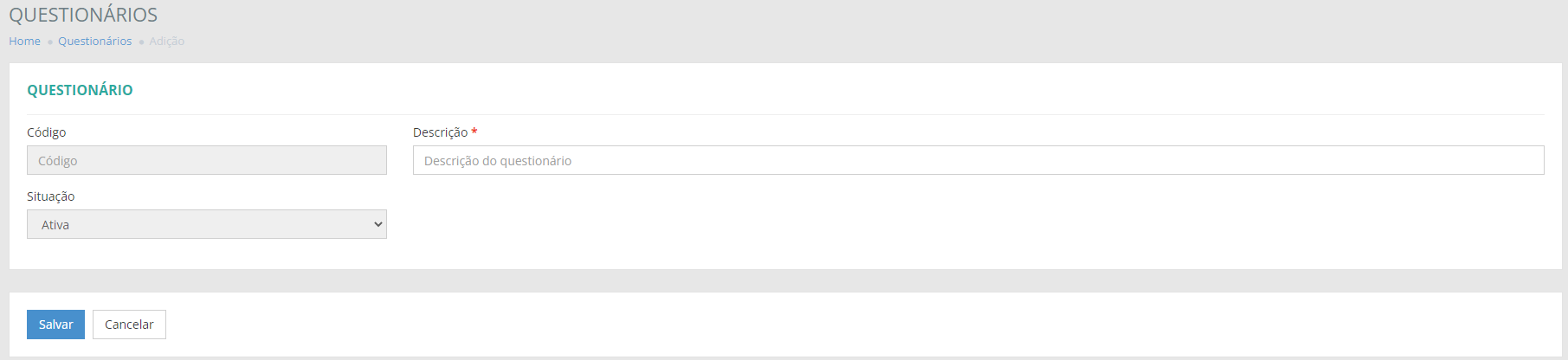 Na tela Questionários informe a descrição do questionário e clique em Salvar. O sistema busca automaticamente o valor do campo Código.