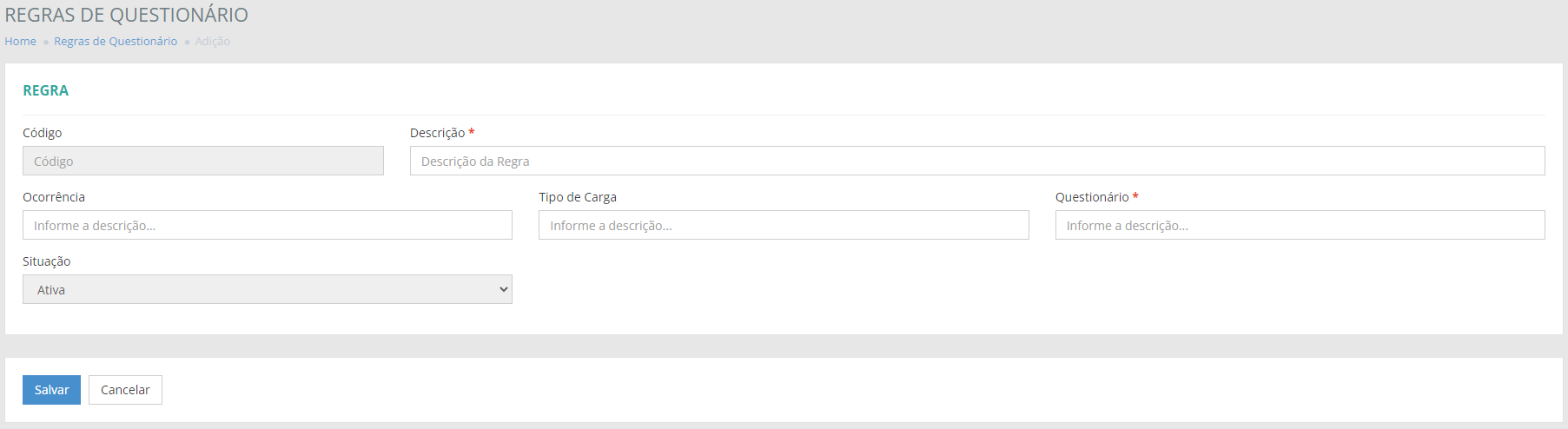 Para cadastrar as regras de questionários, clique em Adicionare informe os campos de Descrição e Questionário que são campos obrigatórios, os campos de Ocorrência, Tipo de Carga e Espécie de Carga não são obrigatórios, mas o sistema permite que seja cadastrado somente uma regra genérica, sendo assim, é permitido comente o cadastro de um questionário sem os campos de Ocorrência ou Tipo de Carga.
