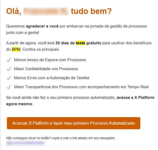 A confirmação da ativação do trial é enviada por e-mail aos usuários cadastrados. Essa mensagem inclui informações com o seu nome, o produto que será iniciado e a data de início. Cada produto possui um registro exclusivo e independente para sua ativação, com períodos de trial distintos.