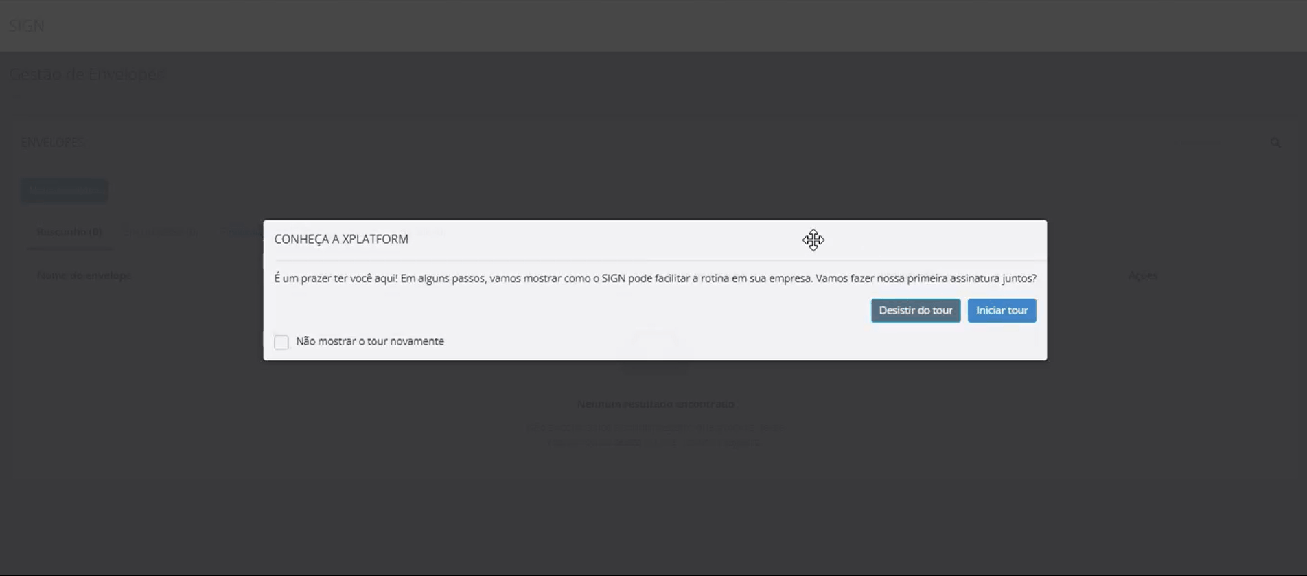 Para melhorar a experiência no primeiro acesso, implementamos um tour guiado na funcionalidade de gestão de envelopes. Ele ajuda novos usuários a entenderem o processo e aproveitarem melhor a criação de envelopes de forma simples e intuitiva.