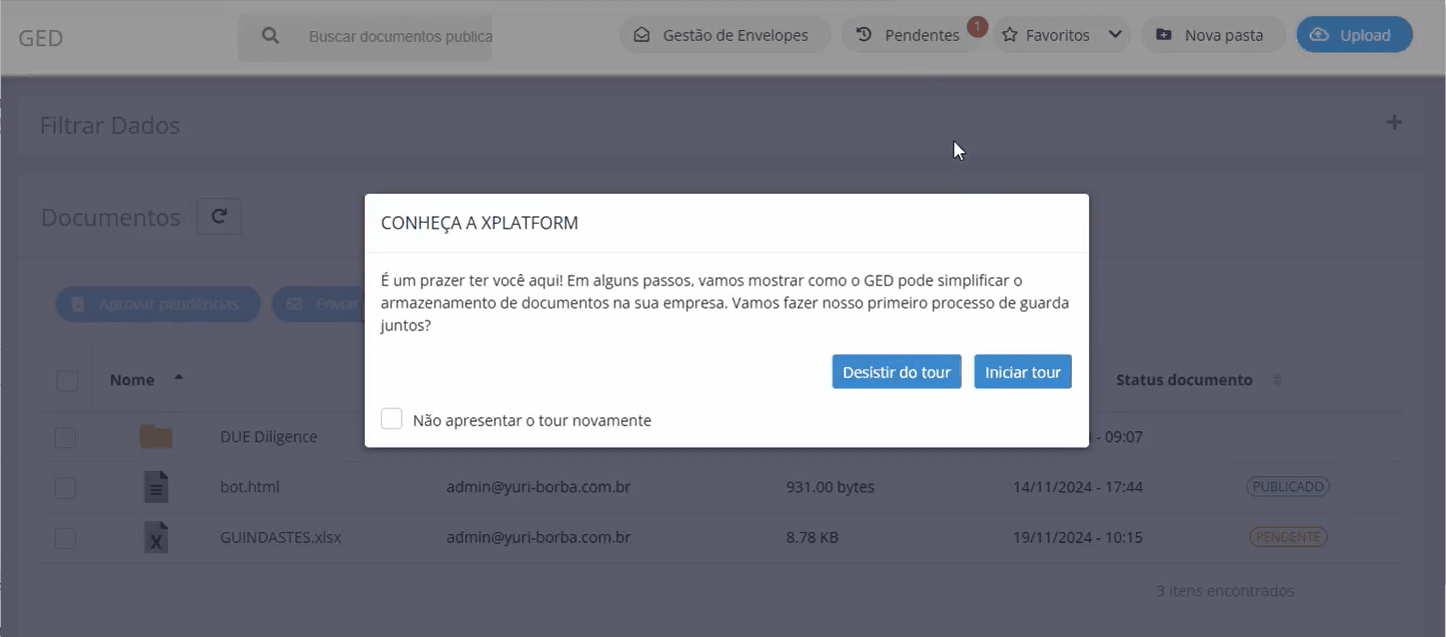 Para melhorar a experiência no primeiro acesso, implementamos um tour guiado na funcionalidade de gestão de envelopes. Ele ajuda novos usuários a entenderem o processo e aproveitarem melhor o upload de documentos/pastas de forma simples e intuitiva.
