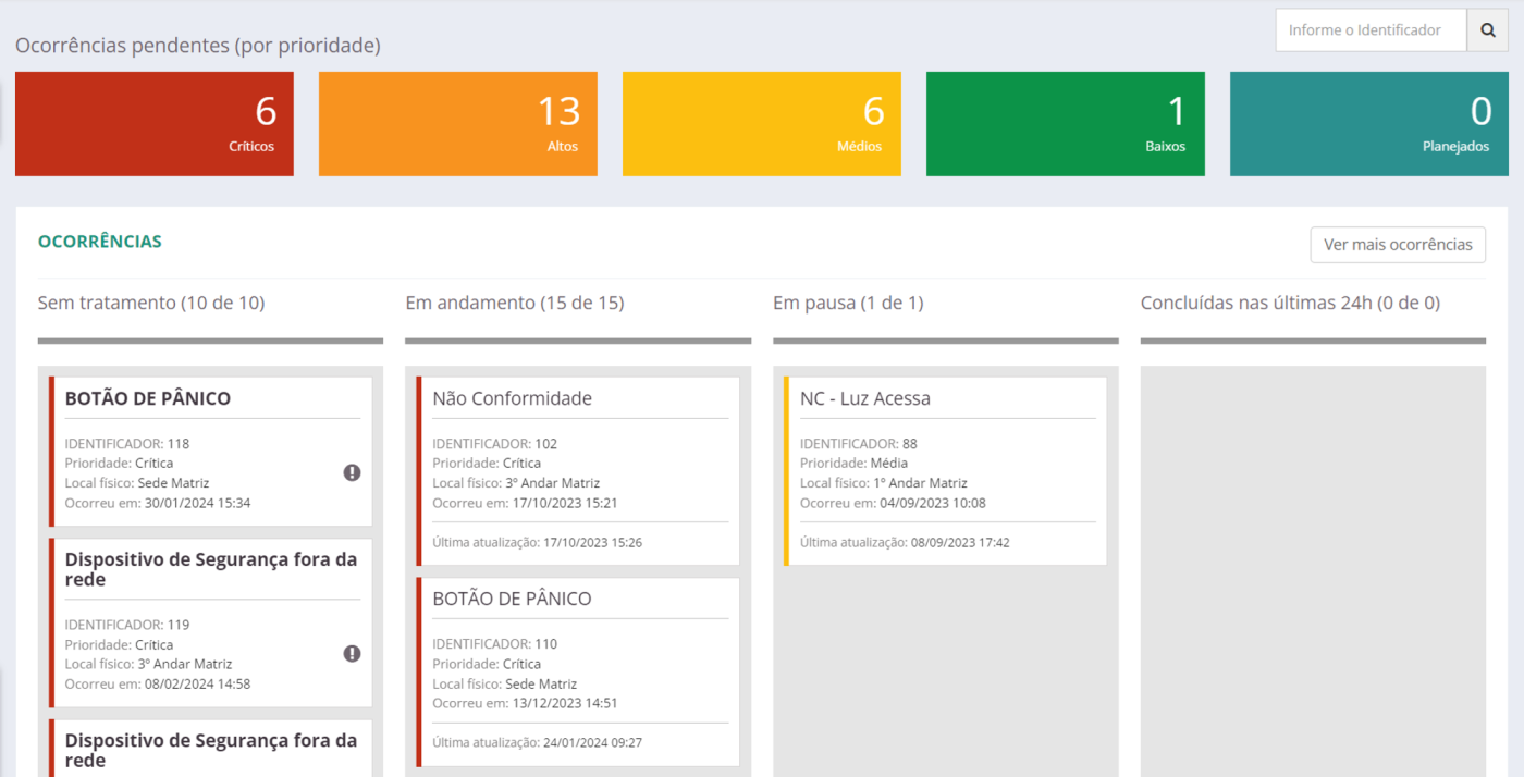 Este painel exibe as ocorrências pendentes de acordo com sua prioridade ("Críticas", "Altas", "Médias", "Baixas" e "Planejadas") e Status ("Sem tratamento", "Em andamento", "Em pausa" e "Concluídas nas últimas 24h"). Para facilitar a visualização, cada grau de prioridade é relacionado a uma cor, e as ocorrências são mostradas a partir da data mais recente.