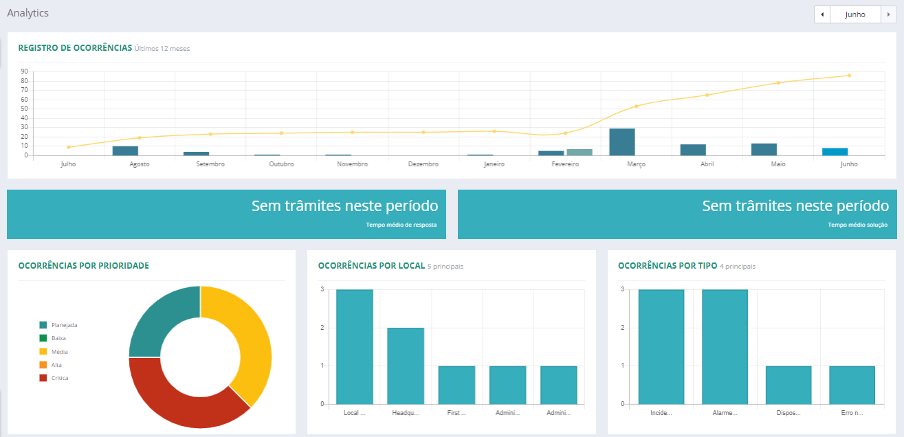 - Totalizadores em horas do mês selecionado para tempos médios de resposta (tempo entre o registro da ocorrência e o primeiro trâmite realizado sobre ela) e solução das ocorrências (desconto dos tempos em pausa);