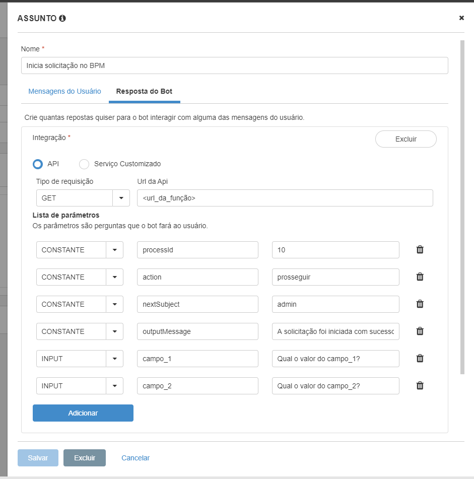 O processId é o identificador do processo que será iniciado. A action é qual ação será executada no processo (ex.: Prosseguir). O nextResponsible será o responsável pela tarefa. O outputMessage será a mensagem a ser exibida pelo BOT quando a solicitação for iniciada.