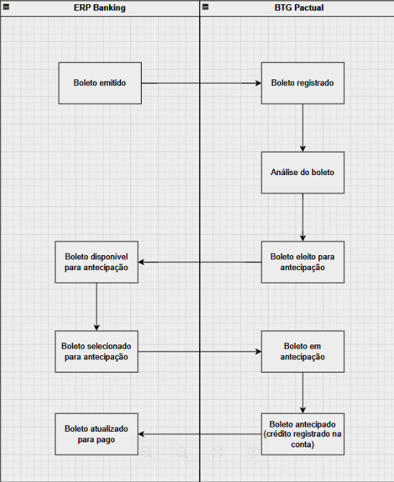 A seguir, apresentamos o fluxo detalhado das etapas envolvidas no processo de antecipação, desde a emissão do boleto no ERP, passando pela análise e antecipação, até a confirmação do pagamento e o crédito do valor na conta da empresa.