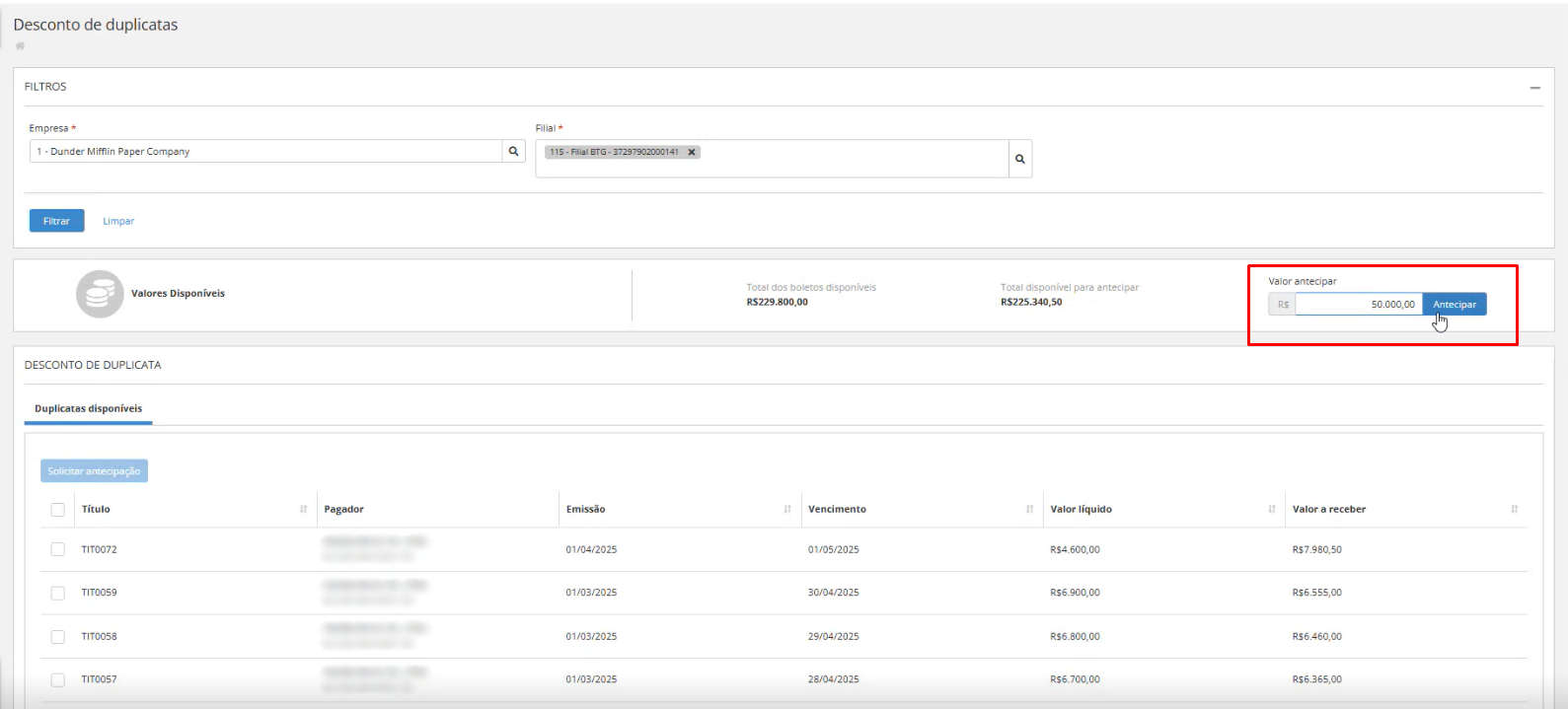 - Em Filtros, insira a Empresa e a Filial. Em seguida clique em Fitrar para listar as duplicatas disponíveis para antecipação;