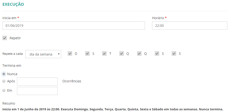 - Clique no botão Criar agendamento e preencha os campos exibidos: