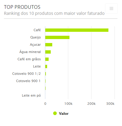 Apresenta os 10 produtos com maior valor líquido de faturamento. O valor líquido apresentado já desconta as devoluções e considera apenas notas fiscais de venda autorizadas e com CFOP configurada para totalizar o valor de faturamento, desconsiderando assim operações de remessa para industrialização ou conserto, por exemplo.