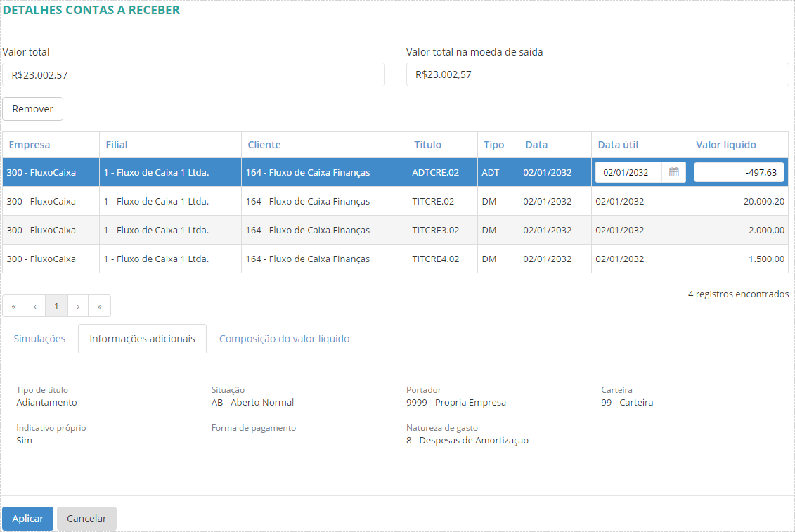 - Aplicações: na tela apresentada, você pode simular uma aplicação com o saldo do fluxo de caixa.