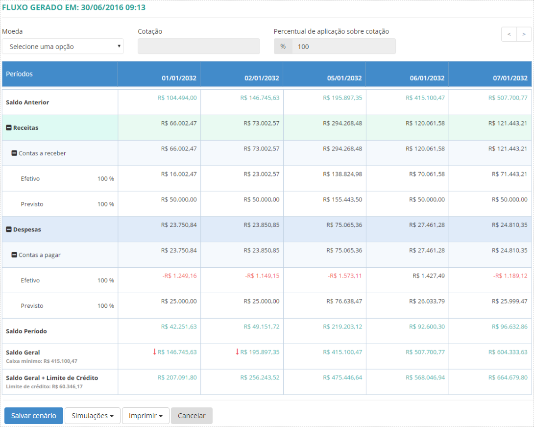 Conforme o cenário selecionado ou fluxo gerado com base em uma parametrização, as informações financeiras são apresentadas considerando a visão e os filtros utilizados.