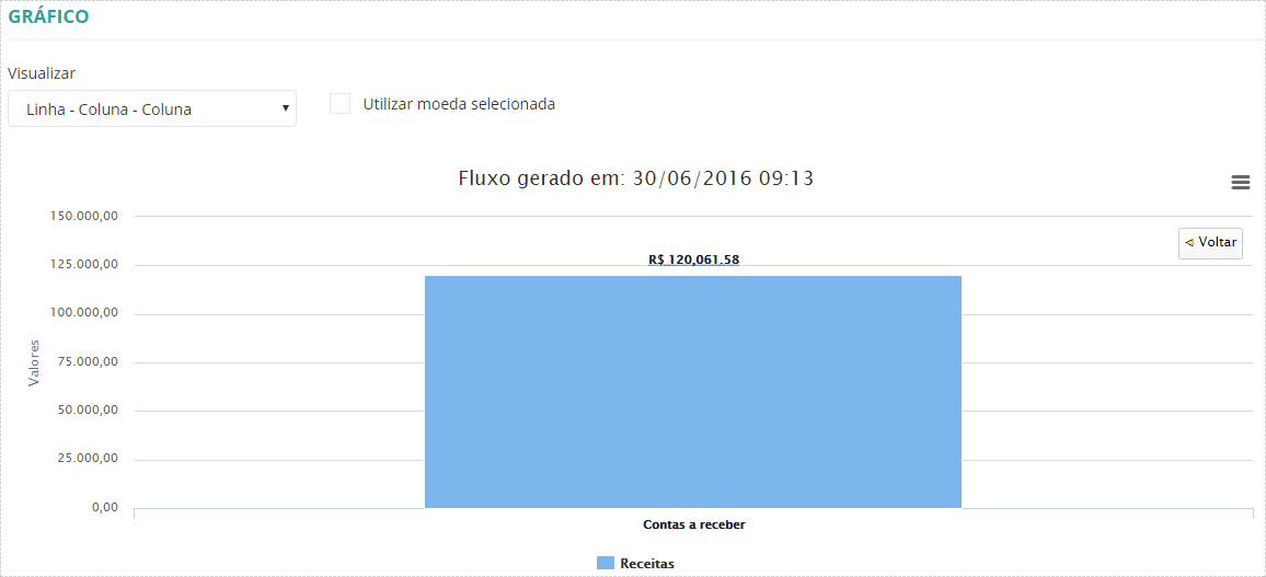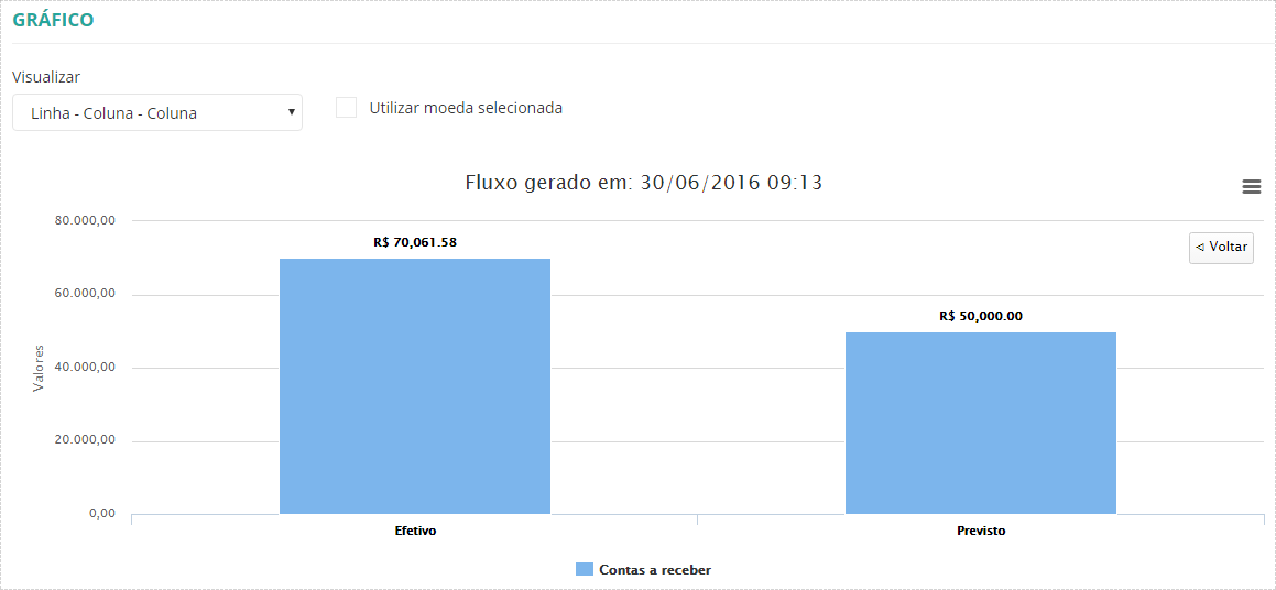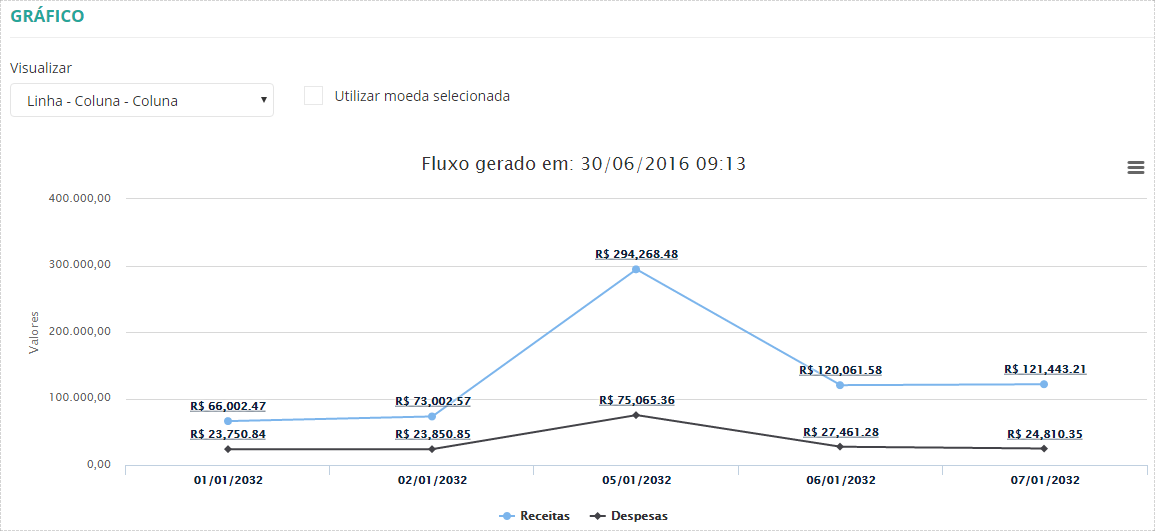 - Marcando a opção Utilizar moeda selecionada, os valores do gráfico são alterados de acordo com a moeda selecionada para o fluxo de caixa.
