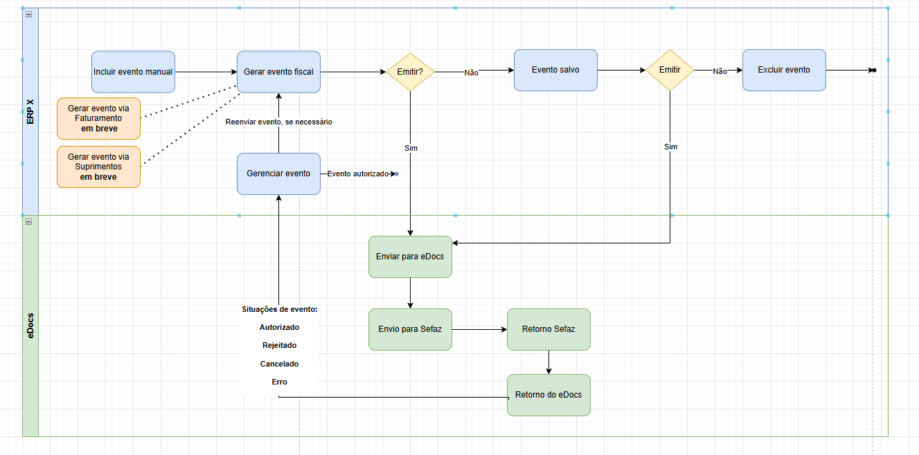 - Para o envio correto dos eventos, o documento de origem deve estar disponível na base do eDocs. Caso o documento não tenha sido emitido pelo ERPX, é possível acessá-lo no eDocs e importar o XML autorizado.