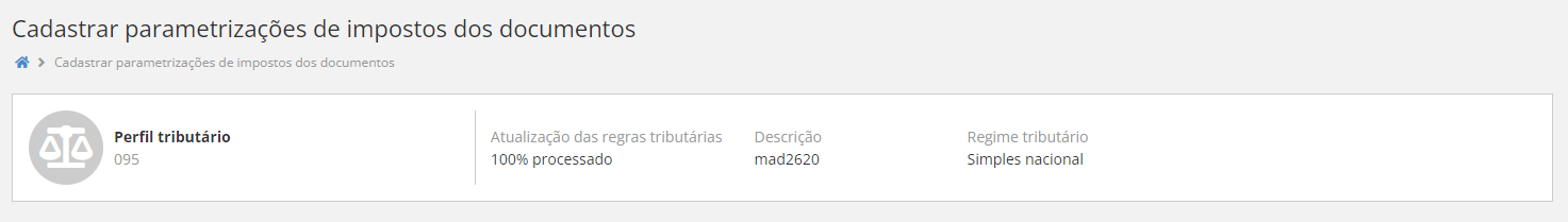 O status em 100%, indica que todas as regras tributárias, para todos is impostos, foram atualizadas com sucesso com base nas parametrizações fiscais existentes.