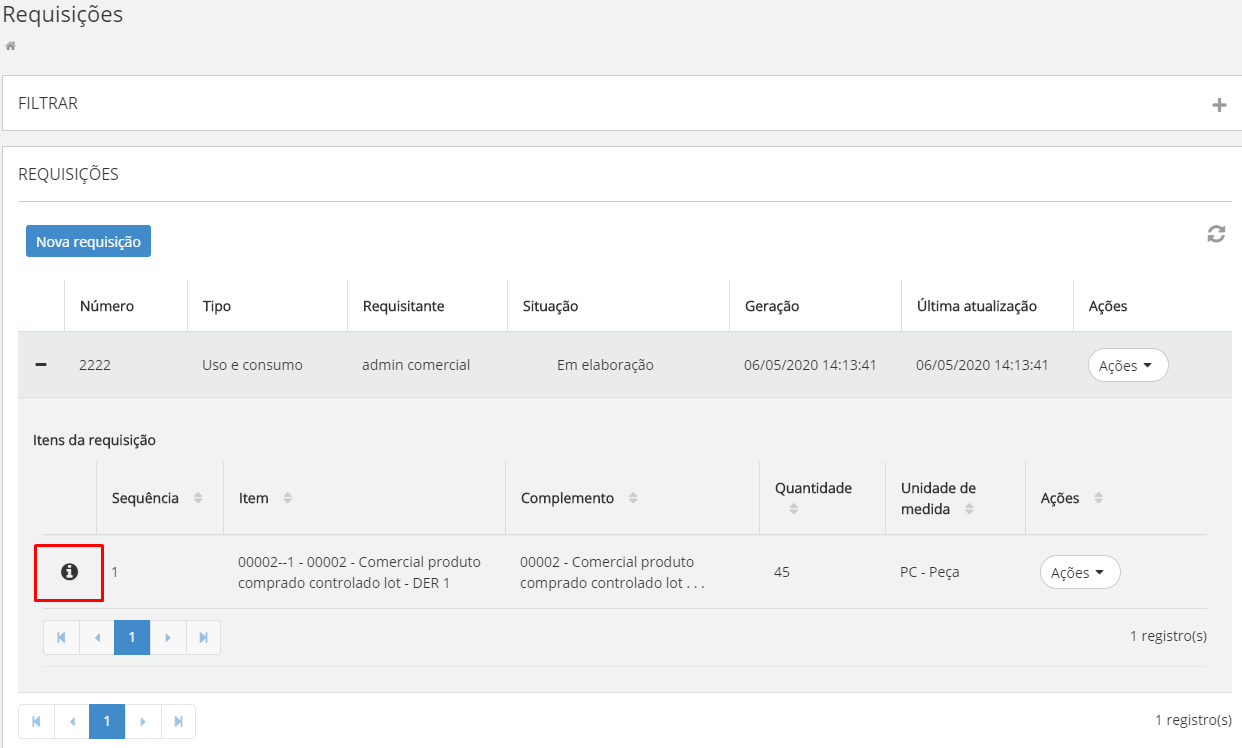 - Após selecionar uma requisição, ao clicar em Ações e escolher a opção Detalhes é possível alterar ou consultar seus dados.