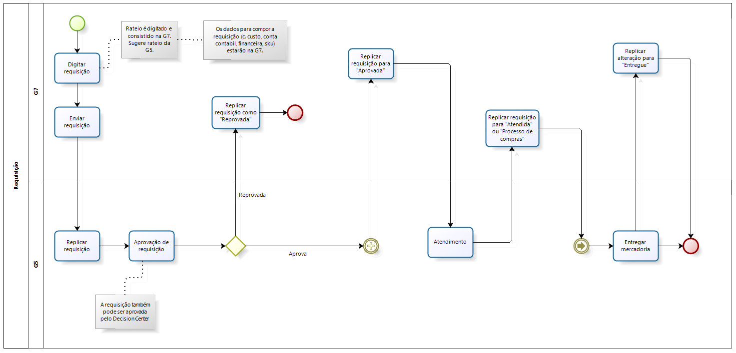 A requisição pode ser submetida a um controle de aprovação no Gestão Empresarial | ERP ou no Senior Decision Center, que pode envolver um ou mais aprovadores. Uma vez aprovada, a requisição pode ser atendida no Gestão Empresarial | ERP, efetuando a movimentação de estoque ou gerando solicitação de compras.