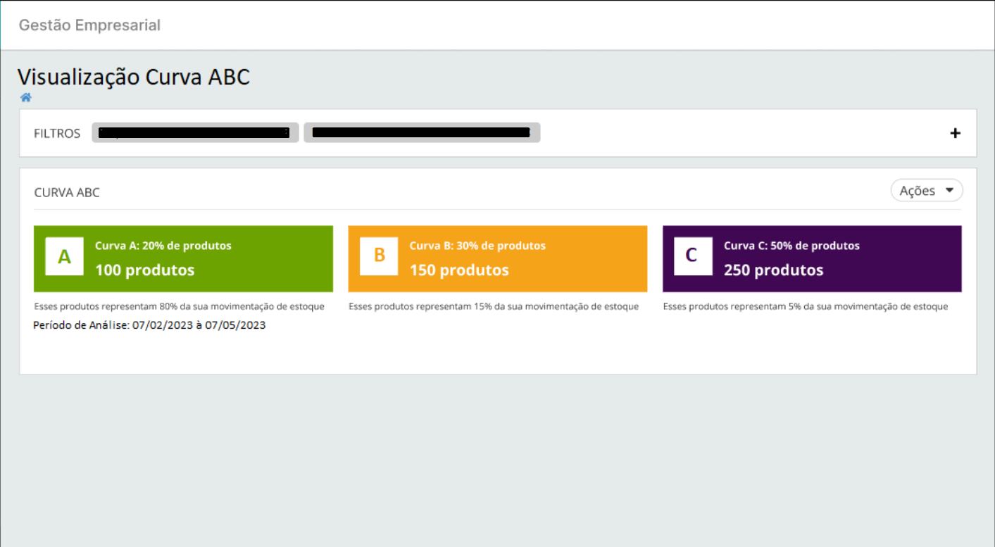 Essa visualização auxilia o usuário por meio de uma análise macro dos produtos com maior ou menor giro de estoque, possibilitando a consulta do saldo dos produto, ao clicar em cada uma das curvas A, B ou C do gráfico.