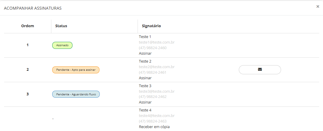Ao acessar essa funcionalidade pela Gestão Eletrônica de Documentos (GED), é possível reenviar o documento para assinatura diretamente na tela de acompanhamento de assinaturas, utilizando o ícone de envelope. Nos demais meios de acesso, essa opção de reenvio não estará disponível na tela de acompanhamento de assinaturas.