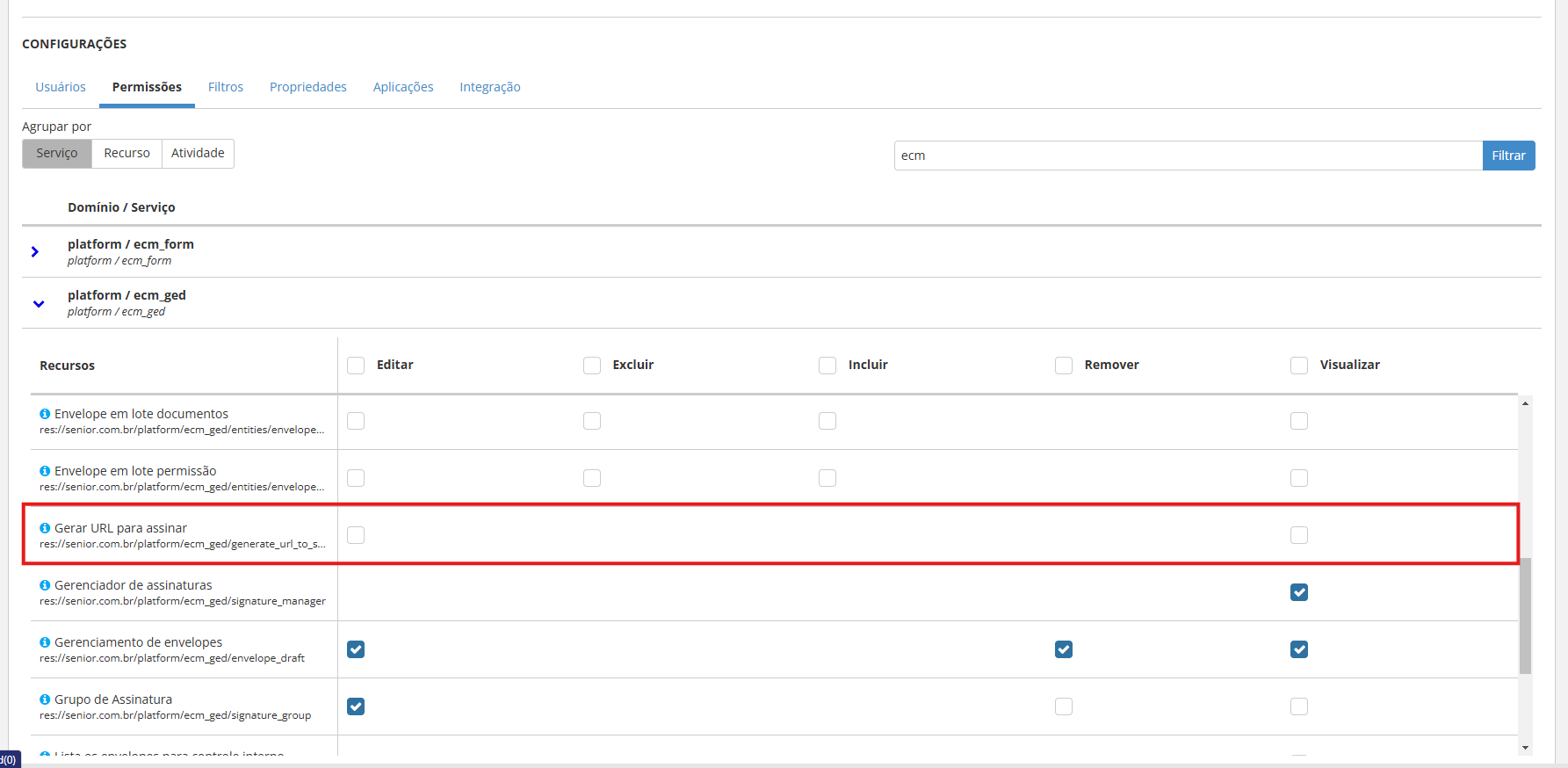 A permissão Gerar URL para Assinar, que, ao ser habilitada para os usuários, permite ativar o botão Gerar Link.