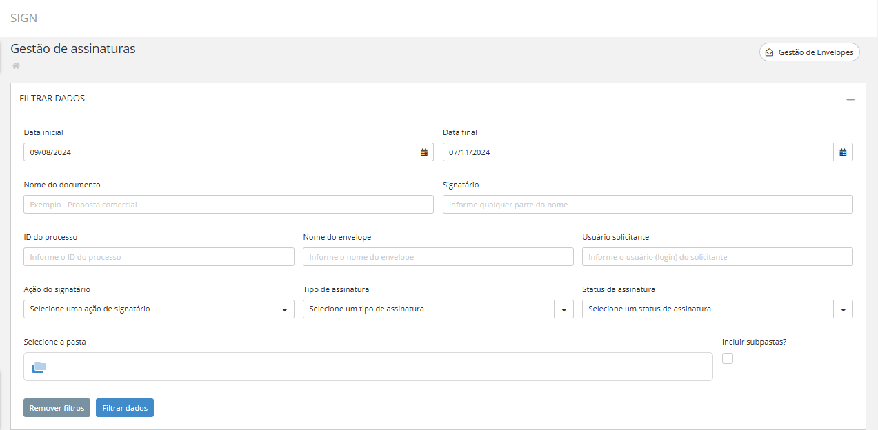 - Signatário: Filtro pelo nome do signatário para quem o envelope foi enviado, permitindo refinar a consulta por destinatários específicos.