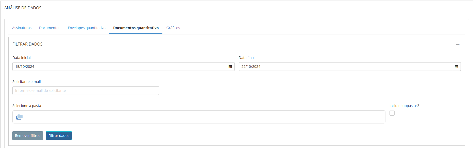- E-mail do Solicitante: E-mail do usuário responsável pela criação do envelope, permitindo a filtragem por solicitante específico.