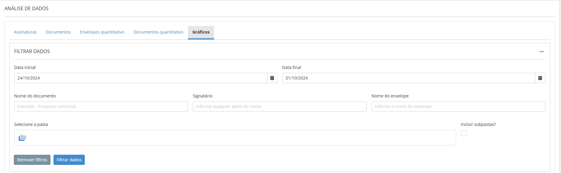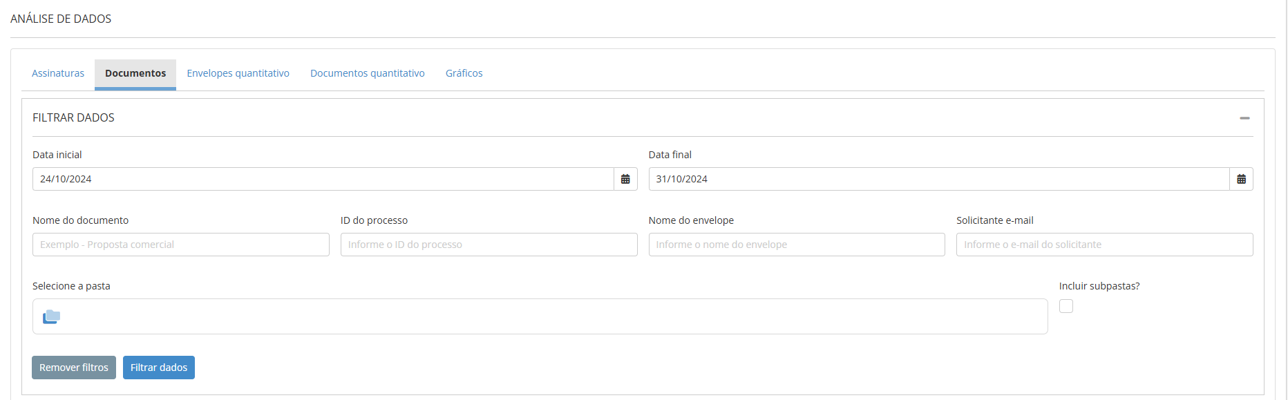- Pasta: Permite filtrar pela pasta onde o documento do envelope está armazenado, considerando apenas os documentos presentes na pasta selecionada, sem incluir documentos das subpastas.