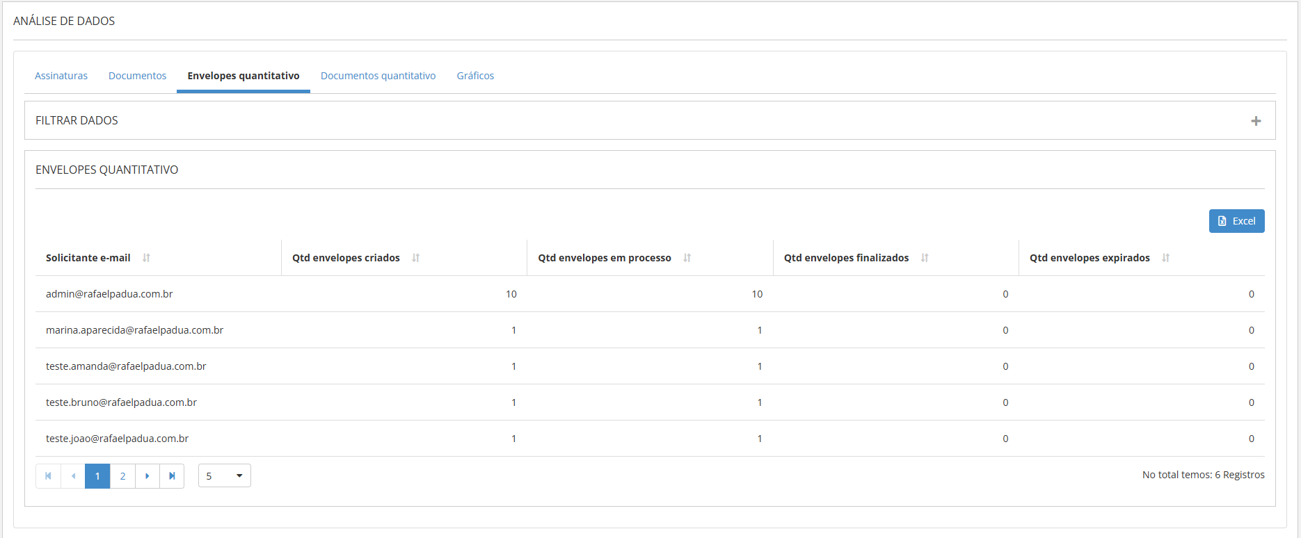 Essa tabela é estruturada com base nos solicitantes de envelopes, onde cada registro representa um usuário do sistema que gerou um ou mais envelopes conforme os filtros aplicados. O objetivo é fornecer ao usuário uma visão quantitativa do número de envelopes associados a cada processo que os usuários do tenant podem ter realizado.