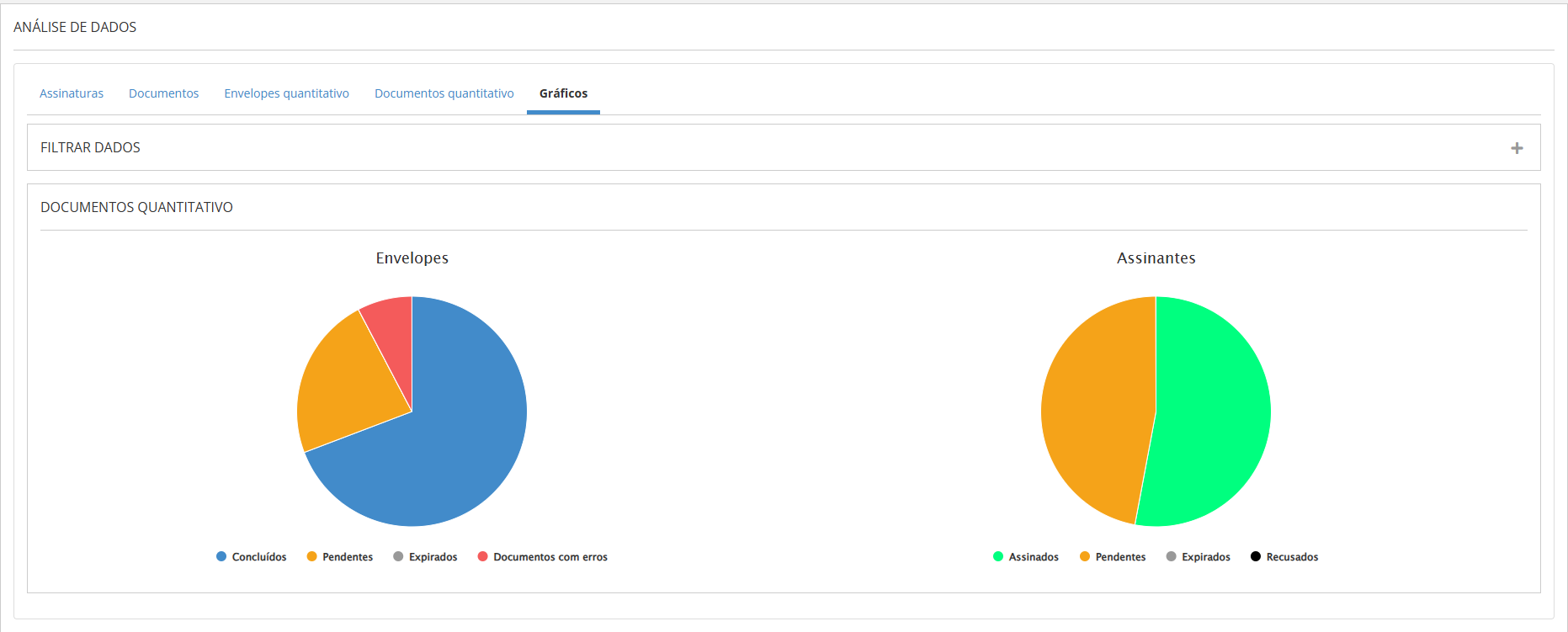 Já o gráfico de Assinantes também aplica o filtro sobre os envelopes, mas realiza a contagem baseada nas assinaturas em vez dos envelopes. Os totais são divididos conforme os status das assinaturas. Importante: nesta consulta, o status do envelope não é considerado. Portanto, se o envelope estiver com erro, mas suas assinaturas estiverem pendentes, essas assinaturas serão contabilizadas como pendentes no gráfico de Assinantes.