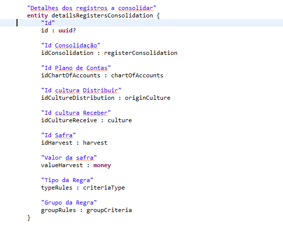 Nas regras de consolidação, cada regra, poderá possuir um tipo de critério, exemplo "Matrizes", "Depósito", "Projeto de fase". Ao gerar a consolidação, o sistema buscará os dados desses grupos e irá filtrar os resultados pelas origens de safras e origem de culturas pré definidas. Além disso, quando o tipo for "Matrizes", o sistema irá buscar todos os dados das matrizes recebidas, aplicando os filtros das configurações, até encontrar o valor de distribuição por safra e cultura, aplicando os resultados no cálculo da consolidação.