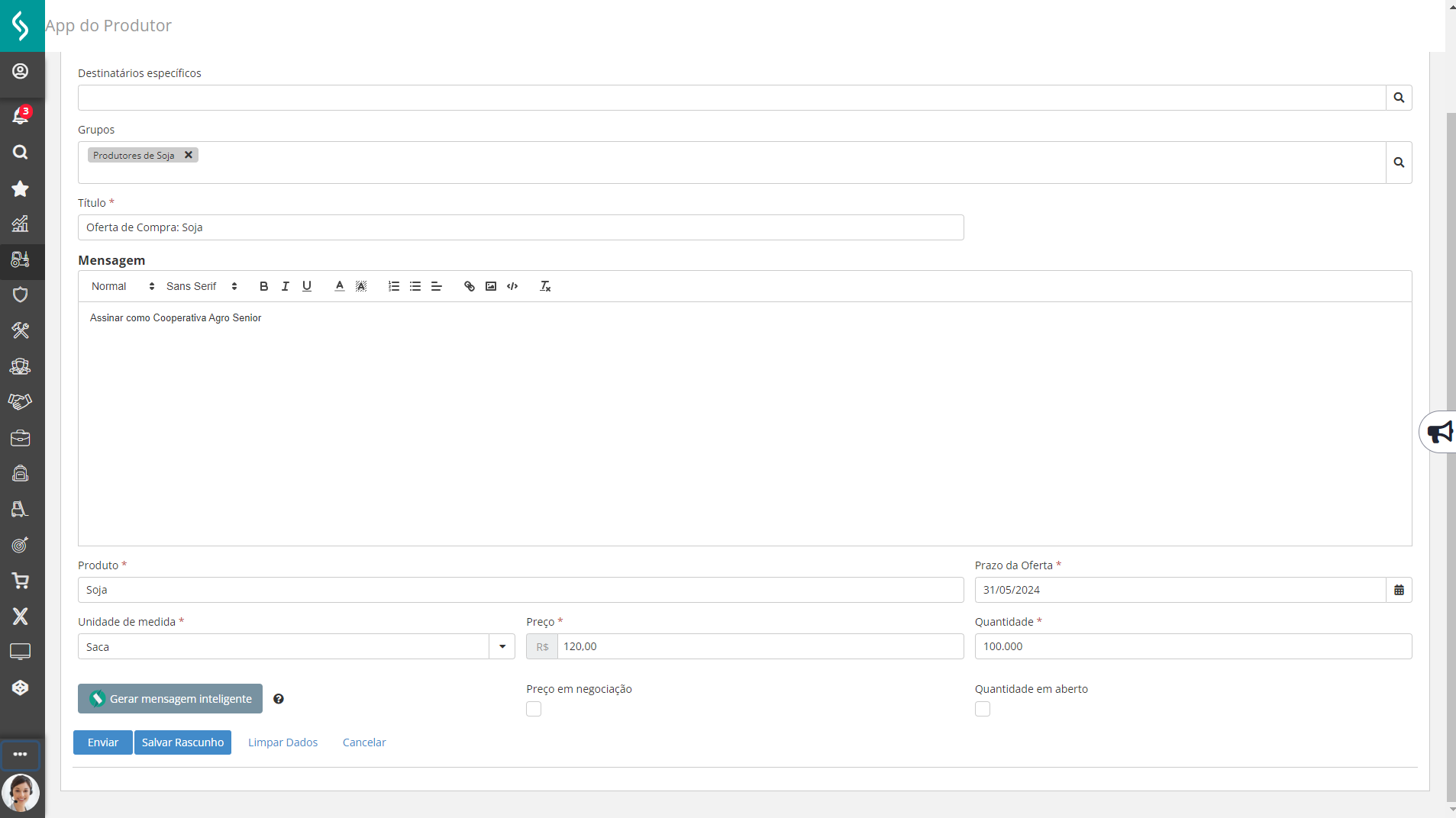 - Os campos Título, Mensagem, Produto, Prazo da oferta, Unidade de medida, Preço e Quantidade são obrigatórios;