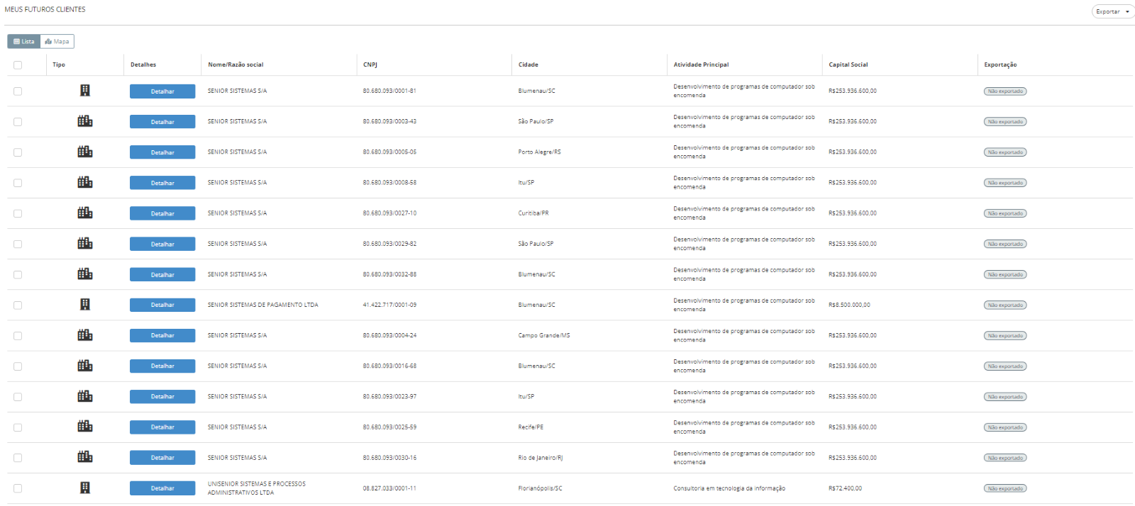 - Para exportar os dados da empresa seleciona, clique em Detalhar, no canto superior direito da lista de futuros clientes;