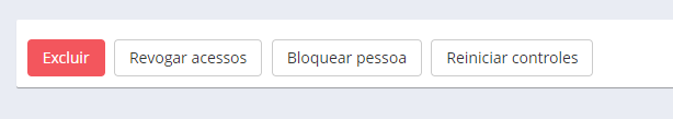 Para revogar um acesso, em Cadastros gerais > Pessoas, localize a pessoa e clique em Revogar acessos. Este botão é mostrado somente se a pessoa não estiver bloqueada. Ao revogar o acesso de uma pessoa: