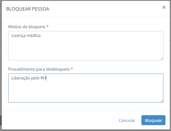 Para bloquear uma pessoa, em Cadastros gerais > Pessoas, localize a pessoa e clique em Bloquear pessoa, preencha o Motivo do bloqueio e quais são os Procedimentos para desbloqueio da pessoa. Ao bloquear uma pessoa: