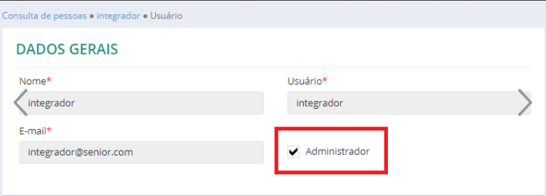 - Crie uma pessoa no Ronda senior X no menu Gestão de Riscos e Segurança > Cadastros Gerais > Pessoas, e associe-a ao login gerado no passo anterior. É importante que esse usuário no Ronda senior X seja colocado como Administrador, conforme a imagem seguinte: