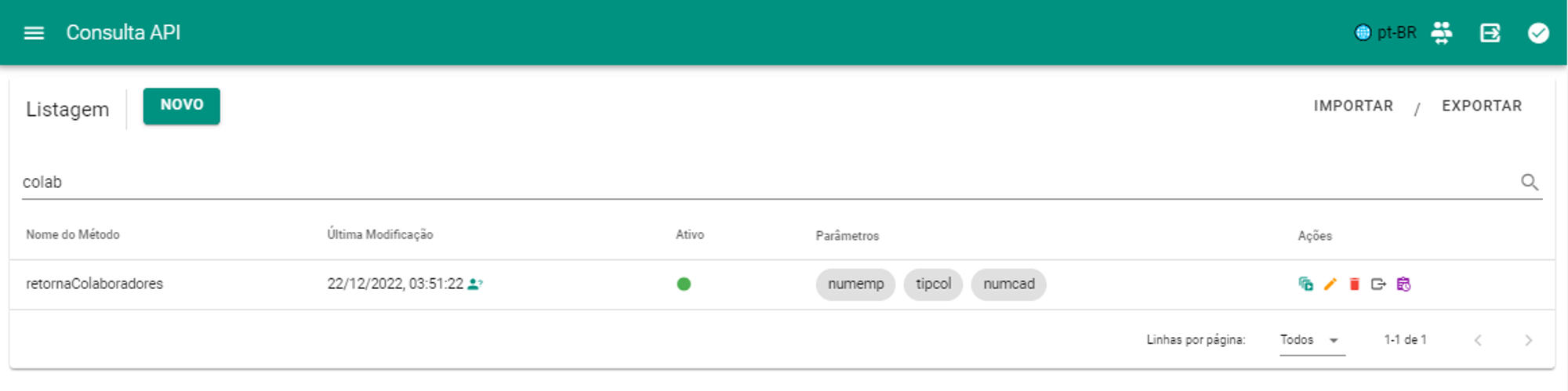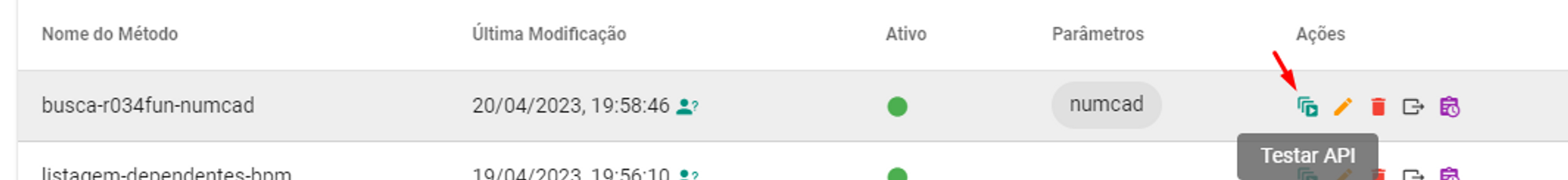 A tela de listagem exibe todas as Consulta APIs do ambiente, permitindo que os usuários visualizem o Nome do Método (equivalente ao endpoint gerado para a chamada da integração), última data de modificação, indicador de integração ativa e os parâmetros de URL que podem ser enviados.