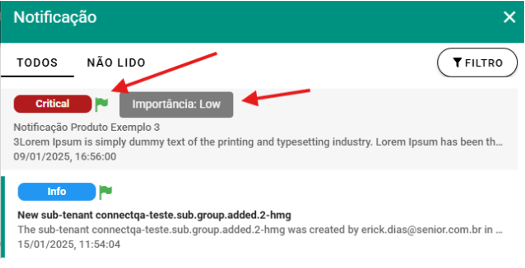O usuário tem a opção de marcar as notificações como lidas, impedindo que sejam exibidas novamente. Além disso, é possível filtrá-las por tipo e importância.