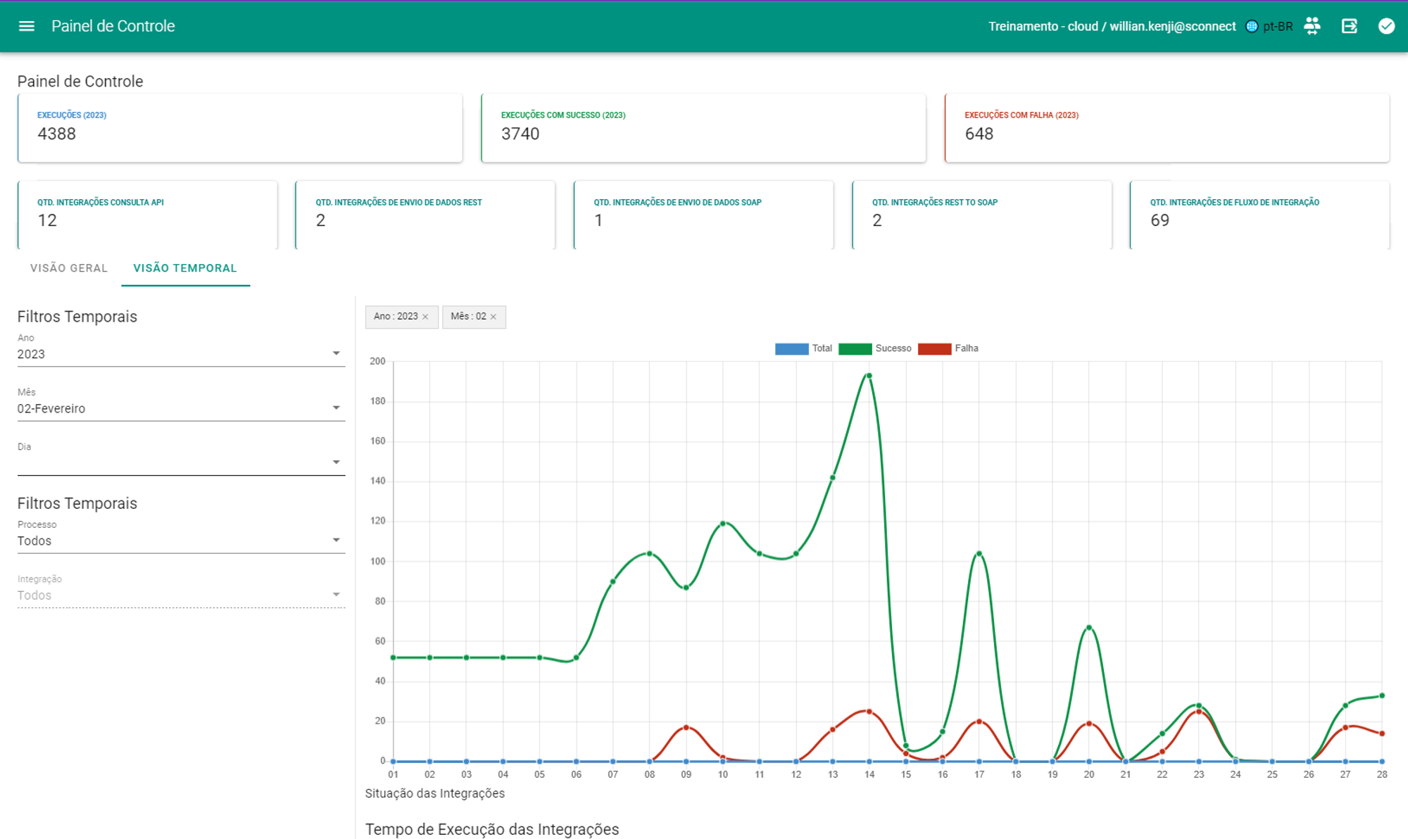 Tela disponível para acompanhamento das métricas, disponibilizando a visibilidade do número total de integrações executadas e a linha do tempo dessas integrações.