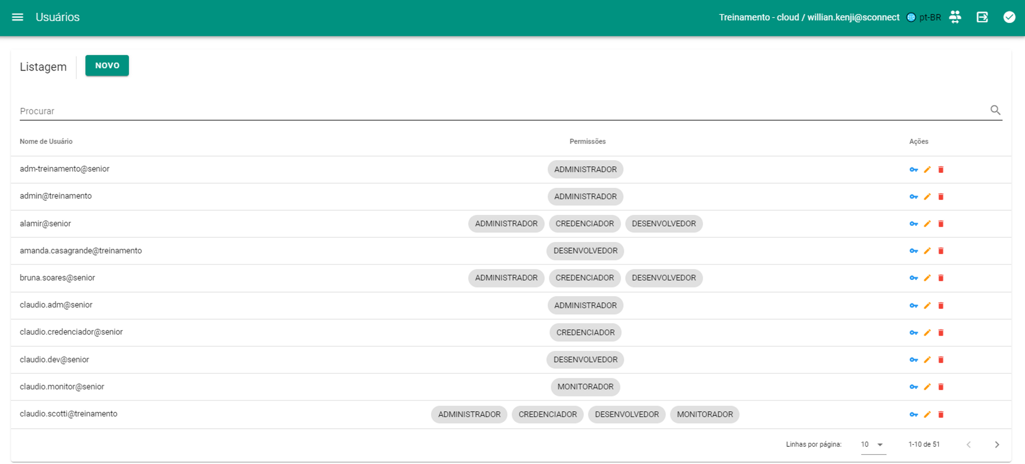 Com o cadastro finalizado, será possível cadastrar os usuários no sub-tenant criado. Na tela de usuários, clique em NOVO.