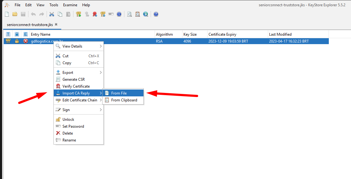 Com o Certificado exportado em formato .CERT, basta clicar com botão sobre o Certificado Vencido no Keystore explorer e selecionar Import CA Reply, From File.