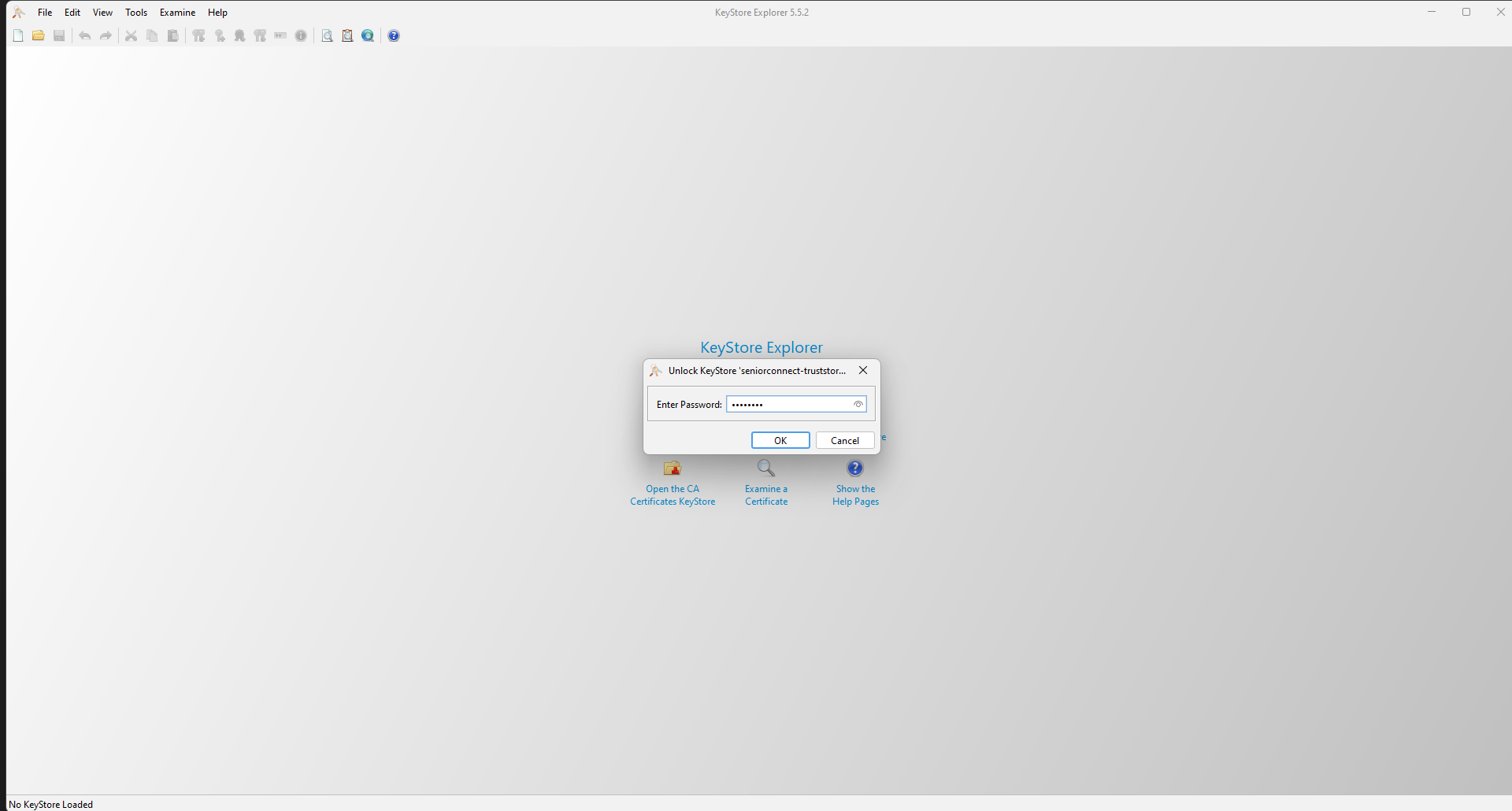 Ao abrir o arquivo, o programa Keystore Explorer solicitará uma senha. A senha está disponível no arquivo mencionado acima, na linha server.ssl.key-store-password, ou seja, changeit.