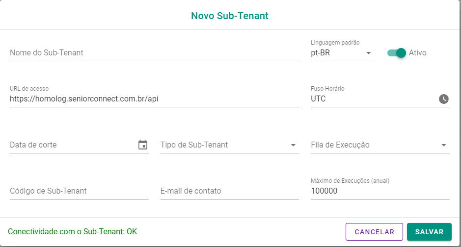 - Tipo de Sub-Tenant*: Homologação (tenant para uso) ou Agrupador (tenant pai para separar demais sub-tenants);