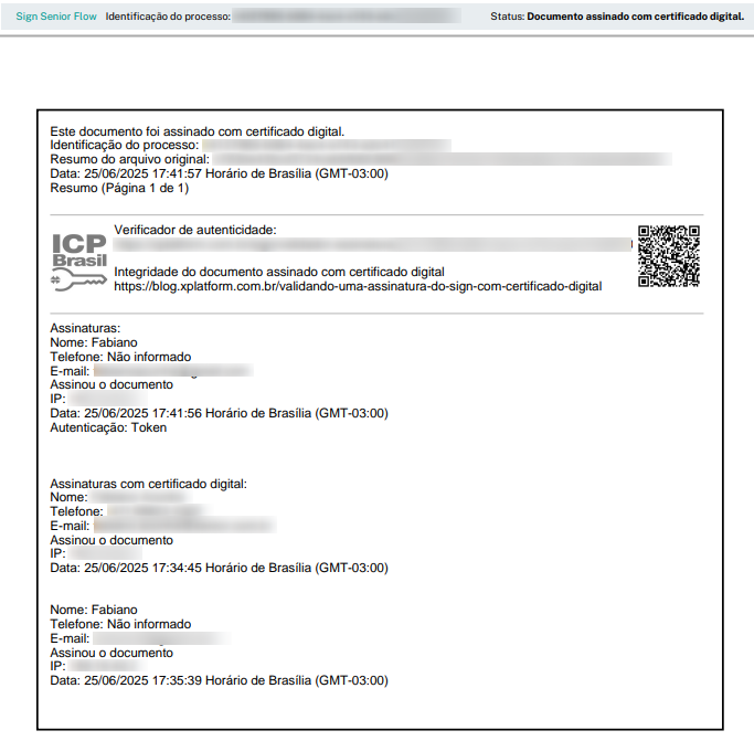 Após a conclusão do processo de assinatura, o usuário solicitante receberá uma notificação por e-mail. Ao clicar em Visualizar Assinaturas, a mensagem Este documento foi assinado com certificado digital será exibida no registro de assinaturas.