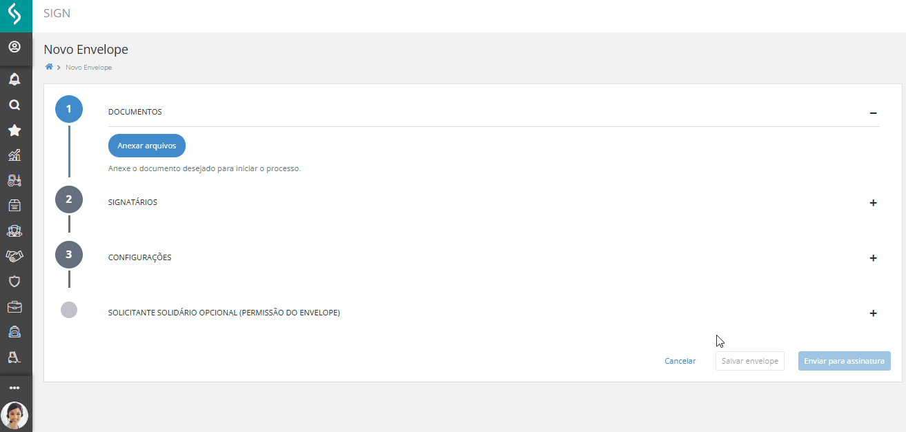 A criação de um envelope é o ponto de partida para o processo de assinatura no SIGN. Para iniciar, clique em Novo Envelope. Dentro dele, você poderá reunir os documentos, definir os signatários, ajustar as configurações e, se necessário, conceder permissões adicionais a outros usuários.
