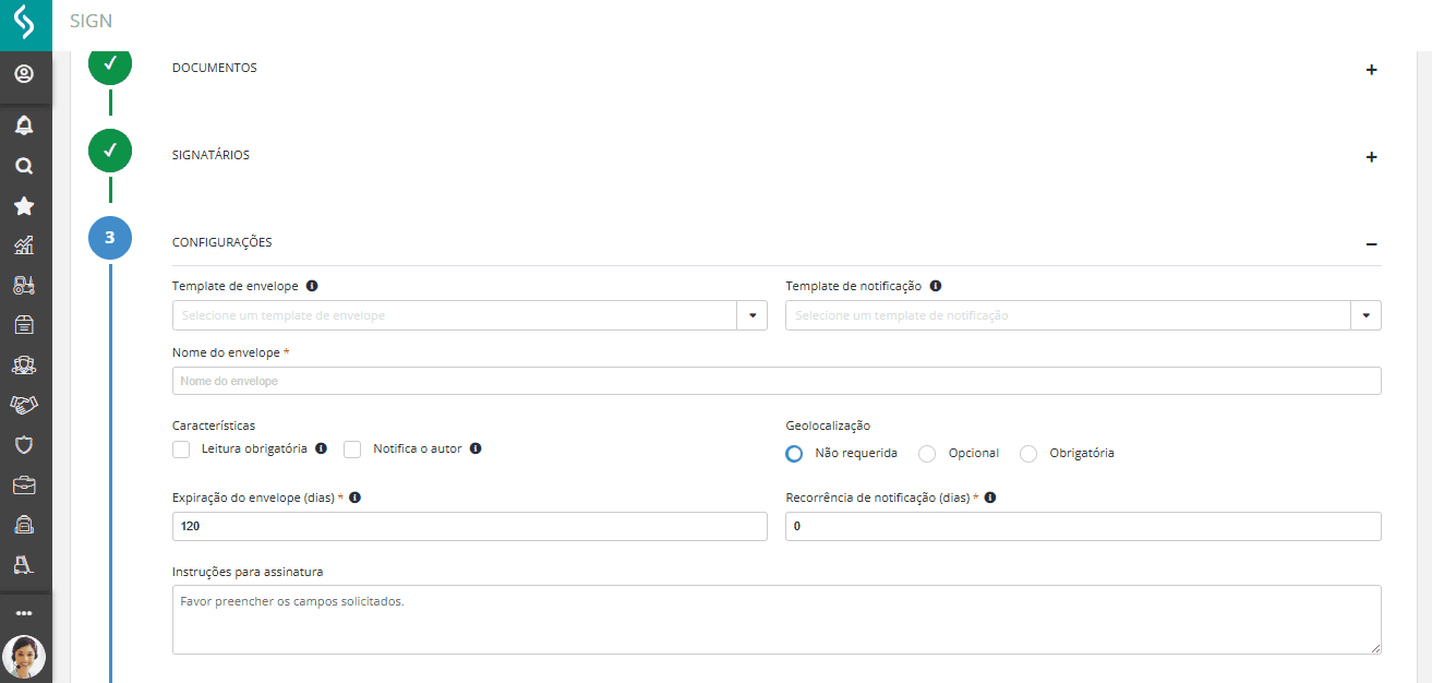 - Nome do Envelope: identifica o processo de assinatura (campo obrigatório).