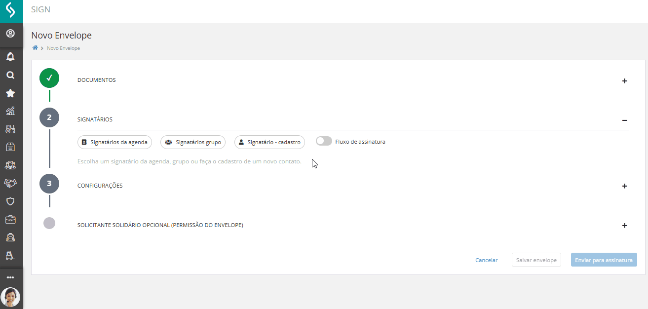 Após anexar os documentos, a seção Signatários é aberta automaticamente. Nela, você define quem irá assinar o envelope e como será feita a inclusão.