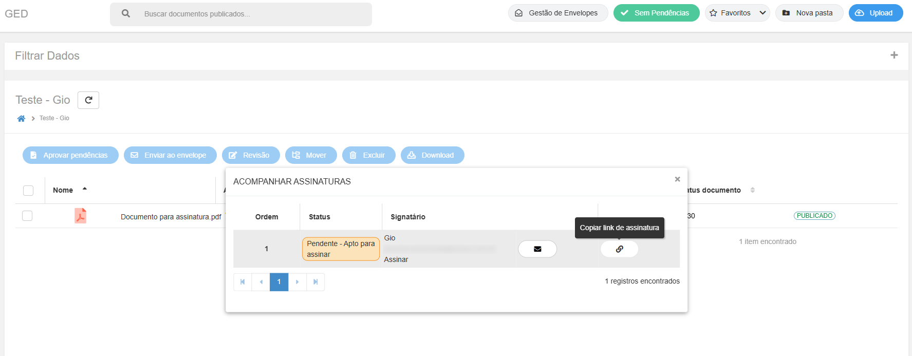 Dentro da funcionalidade de gestão de envelopes, é possível gerar um link de assinatura para envelopes em processo de forma prática. Essa opção está disponível em diversas telas, incluindo Gestão de Envelopes e Coleta de Assinatura.